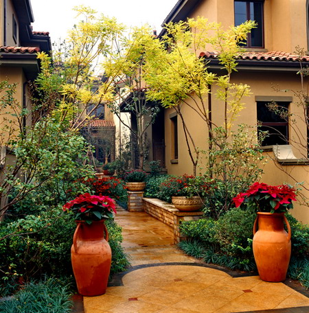 意式鄉(xiāng)村風(fēng)格以自然質(zhì)感的磚石為主,但鋪裝材料多切割成規(guī)則的形狀,適當(dāng)?shù)厥褂貌噬纱u。木質(zhì)結(jié)構(gòu)的廊架等構(gòu)筑物,色彩上要兼顧到周邊建筑和整體庭院風(fēng)格,但是不建議用原色。這種風(fēng)格使用的裝飾物有:鐵藝桌椅、赤陶花器、石雕花器和獸頭水口,陶質(zhì)的花器的使用,除了赤陶本色,還可以使用赤陶刷涂白色和彩色的盆器,多使用盆器能靈活增加種植組合。植物以自然式種植為主,周邊除了密林外,大量的常綠植物如檜柏也是常用的。植物自然生長(zhǎng),不加修剪,體現(xiàn)自然植物的錯(cuò)落感。